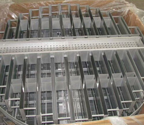 實(shí)現(xiàn)傾斜板對(duì)全截面的覆蓋,能夠?qū)σ后w收集時(shí)提升收集效率,這是柵板式支承-收集-再分布器的最Z大優(yōu)點(diǎn),但是對(duì)于上升氣流的干擾以及高度的增加,會(huì)導(dǎo)致其性能受到一定程度的影響。因此,應(yīng)該采用合理的方式對(duì)柵板式支承-收集-再分布器進(jìn)行改進(jìn)。柵板支承絲網(wǎng)填料的過程中,液體受到上升氣流的影響,會(huì)通過塔壁四周流下。這是由于在網(wǎng)片中存在一定程度的毛細(xì)作用,加上上升氣流的上舉力作用,導(dǎo)致液體下落有在困難。為了有效對(duì)液體進(jìn)行收集,需要采取合理的導(dǎo)流措施。為了便于液體分散落入分布槽中,可以將柵板下緣設(shè)計(jì)為鋸齒狀。液體沿內(nèi)壁流下后通過集液環(huán)由環(huán)形槽收集。多孔型和溢流型柵板式支承-收集-再分布器的設(shè)計(jì),能夠分別在小流量和大流量操作中提升工作效率。